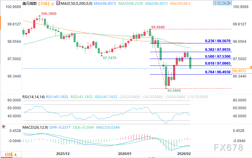 中期波动区间为99.492至95.5660,其回调区间97.522至97.987在上周五97.973点位压制了反弹,进而引发今日回落。新的短期区间为95.5660至97.973,其50%至61.8%回调位96.762至96.476为下一个下行目标,需关注汇价在此出现技术性反弹,还是直接跌破。